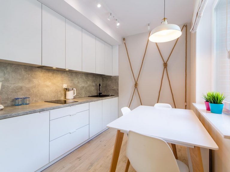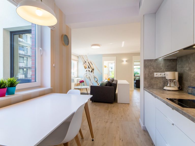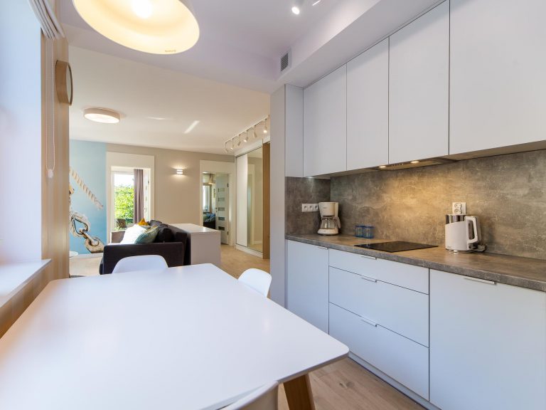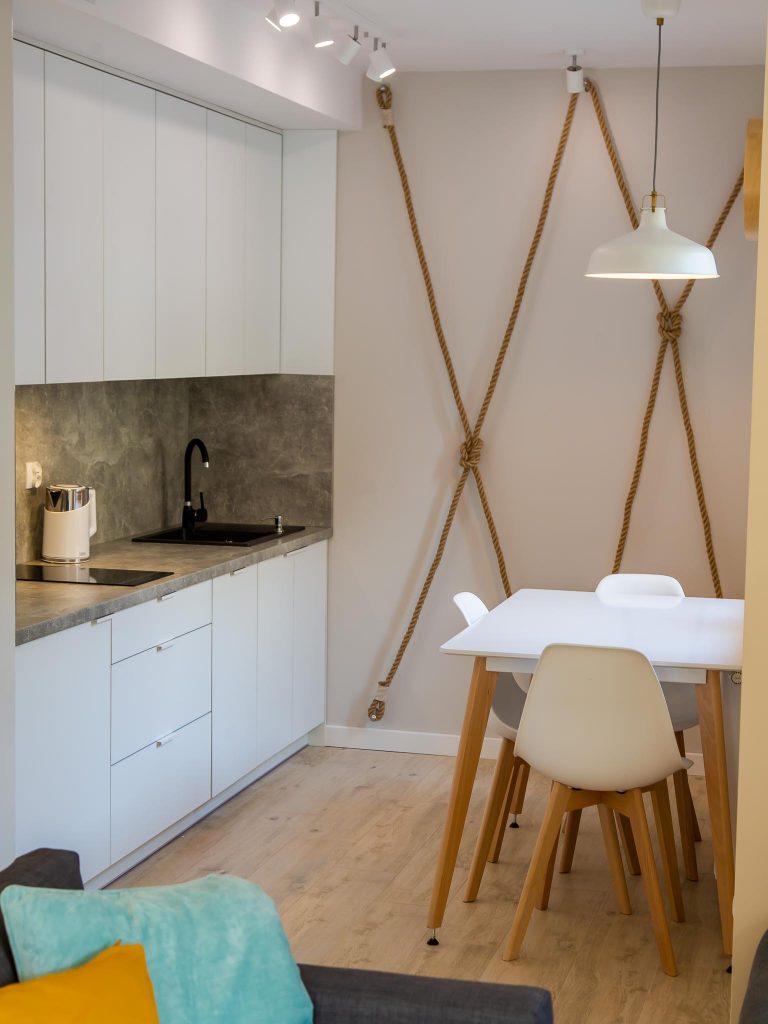 Płyta indukcyjna, chłodziarka z zamrażarką, kuchenka mikrofalowa, zmywarka, komplet zastawy stołowej, czajnik elektryczny, ekspres do kawy, przybory kuchenne, środki czystości, kieliszki do wina, garnki.