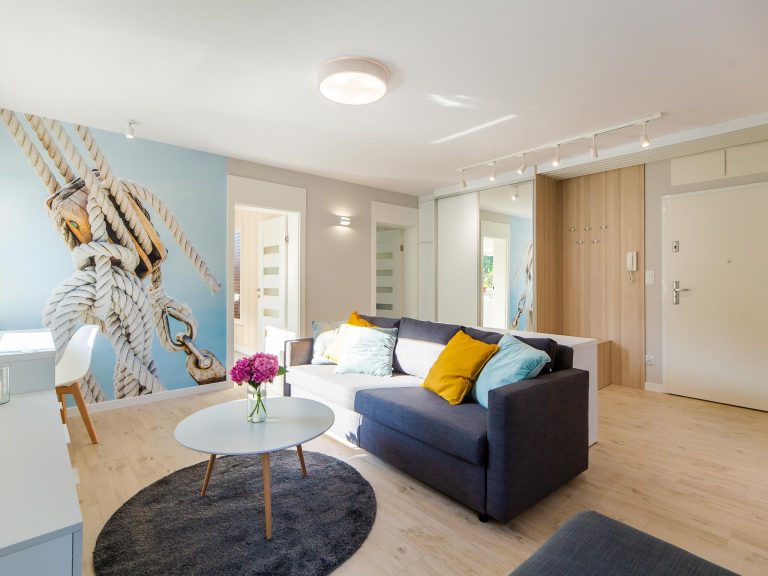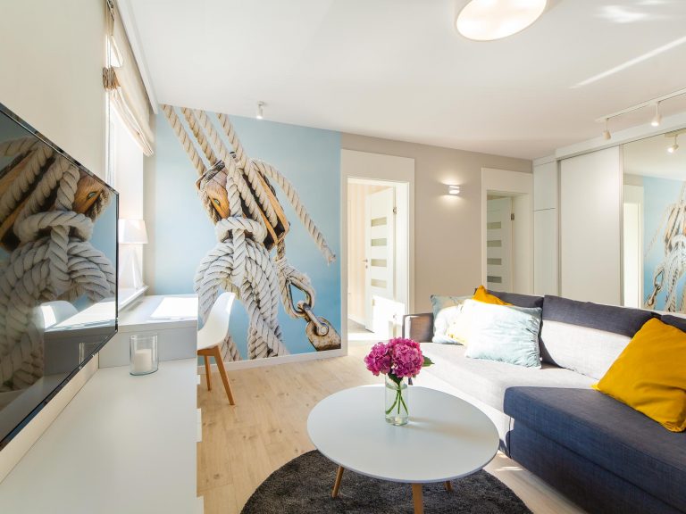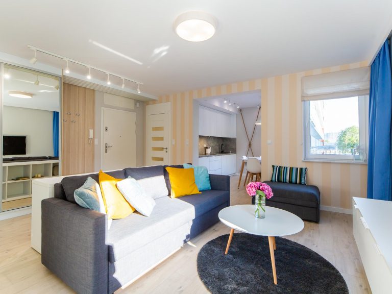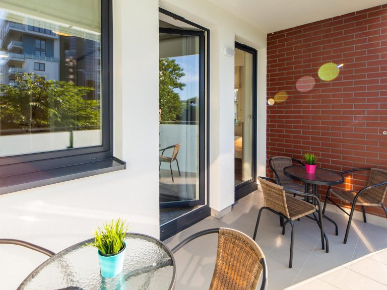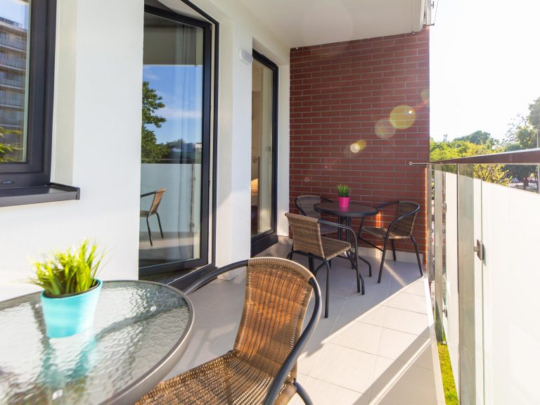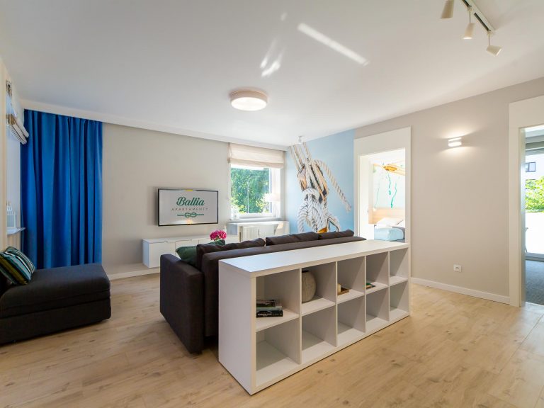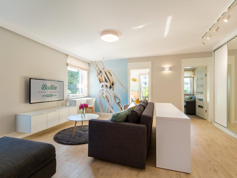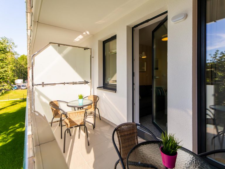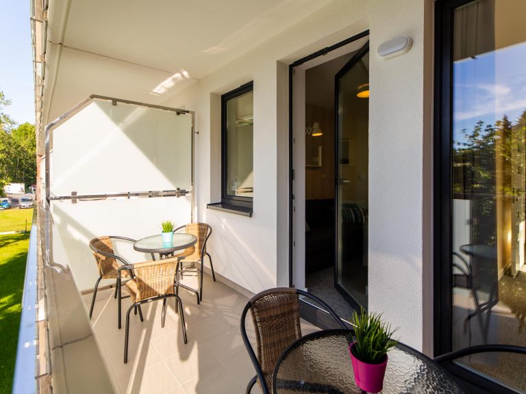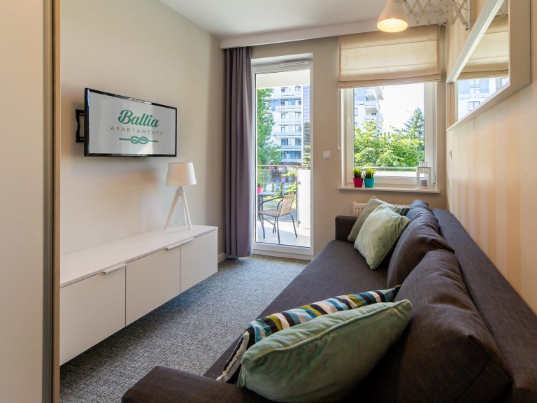 Sofa rozkładana 2 osobowa, komplet pościeli, stolik kawowy, strefa jadalniana , stół z krzesłami, TV, dostęp do balkonu.