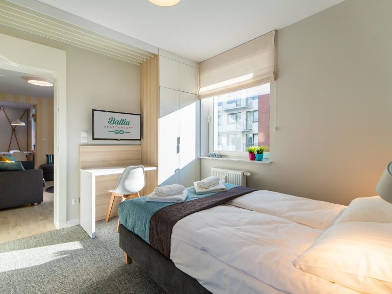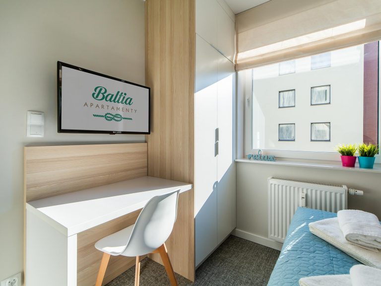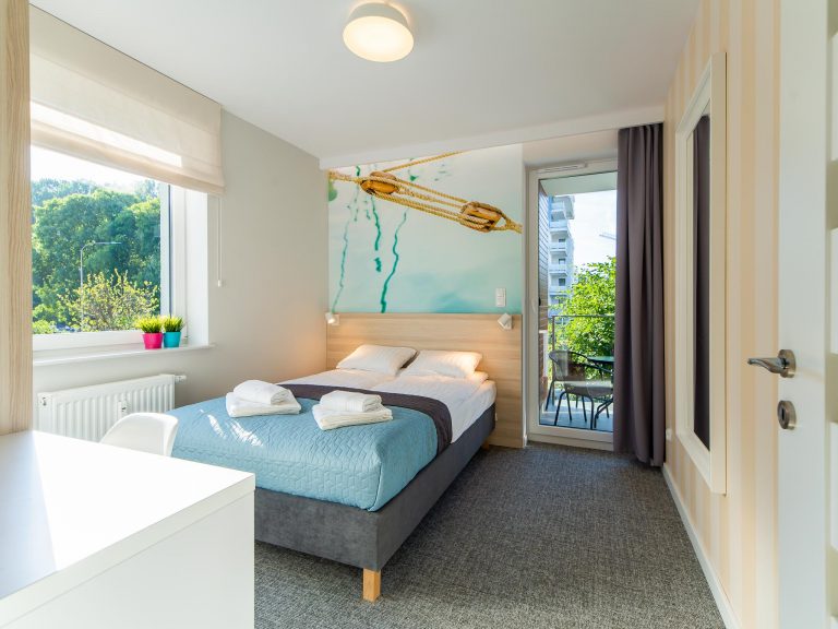 Łóżko podwójne, komplet pościeli,lampki nocne, szafa, biurko, TV, dostęp do balkonu.