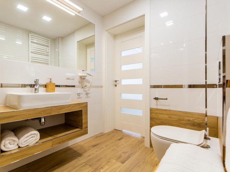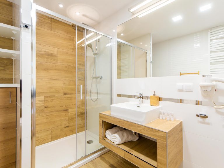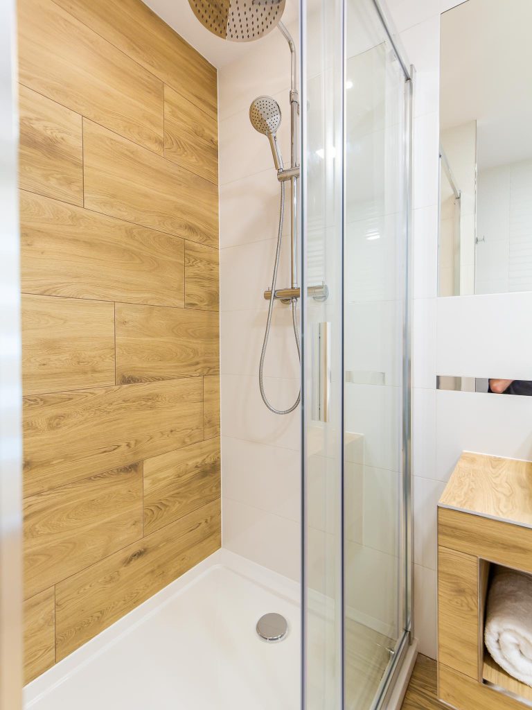 Prysznic, pralka, suszarka do włosów, zestaw ręczników, zestaw kosmetyków.
