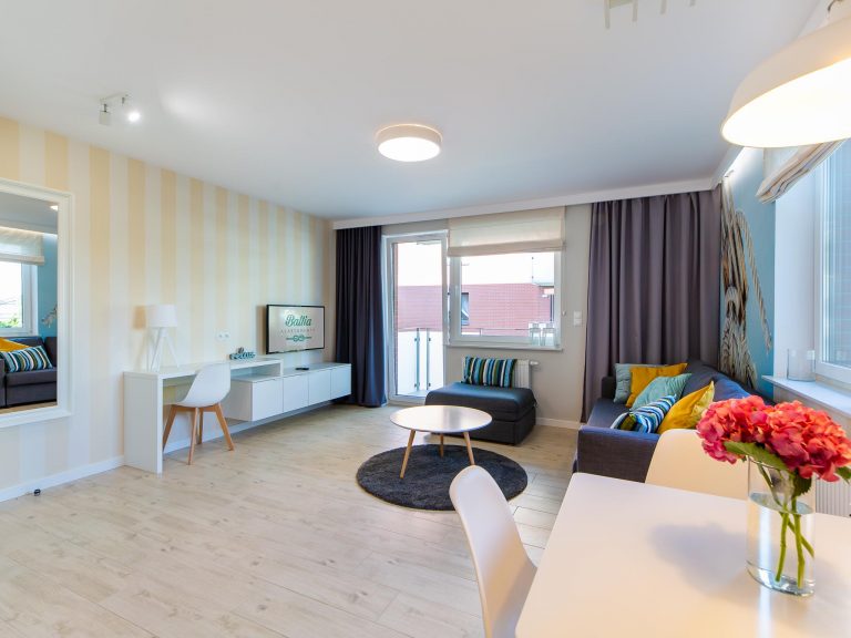 Sofa rozkładana 2 osobowa, komplet pościeli, stolik kawowy, strefa jadalniana, stół z krzesłami, TV, dostęp do balkonu, rozkładane łóżko 1 osobowe.