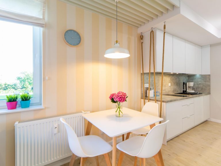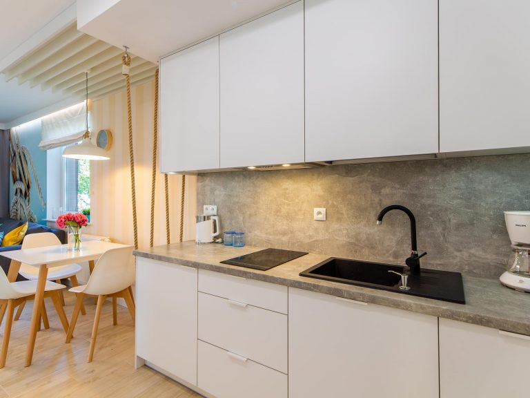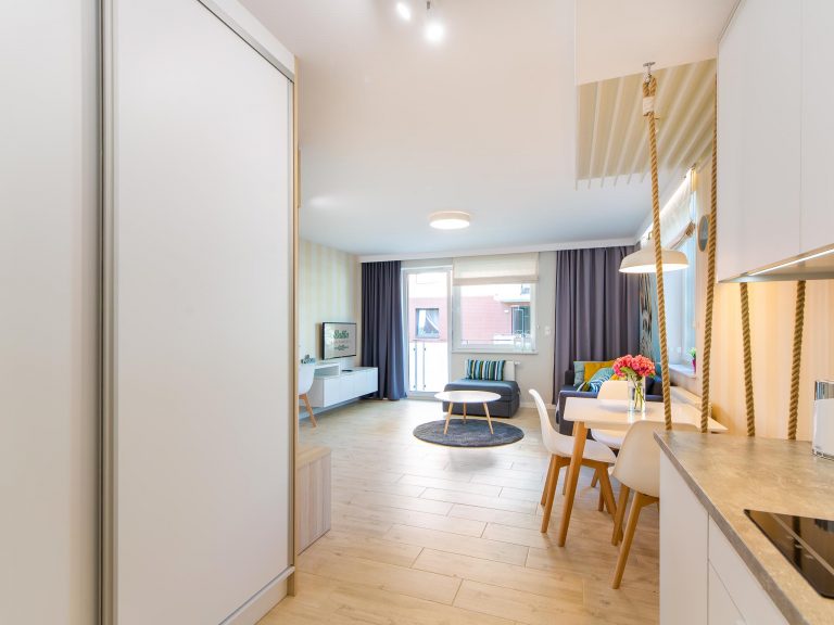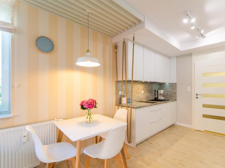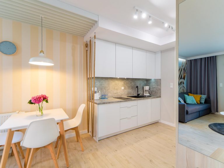 Płyta indukcyjna, chłodziarka z zamrażarką, kuchenka mikrofalowa, zmywarka, komplet zastawy stołowej, czajnik elektryczny, ekspres do kawy, przybory kuchenne, środki czystości, kieliszki do wina.