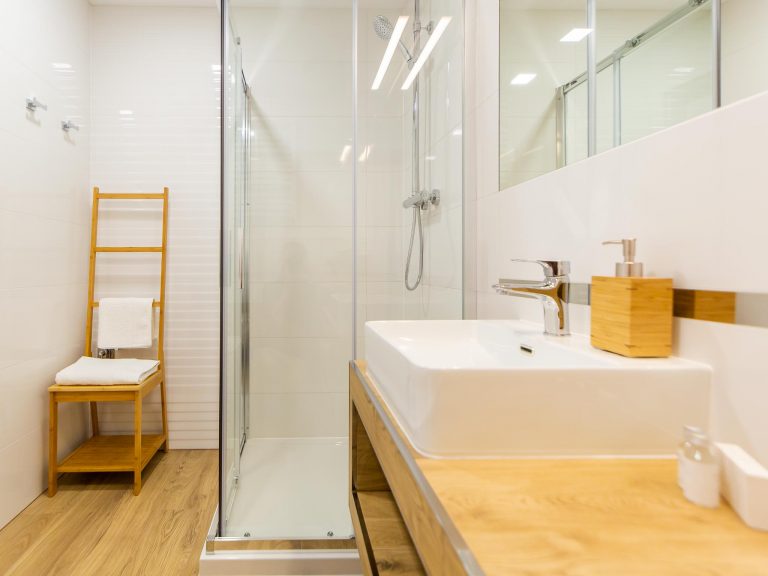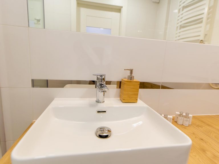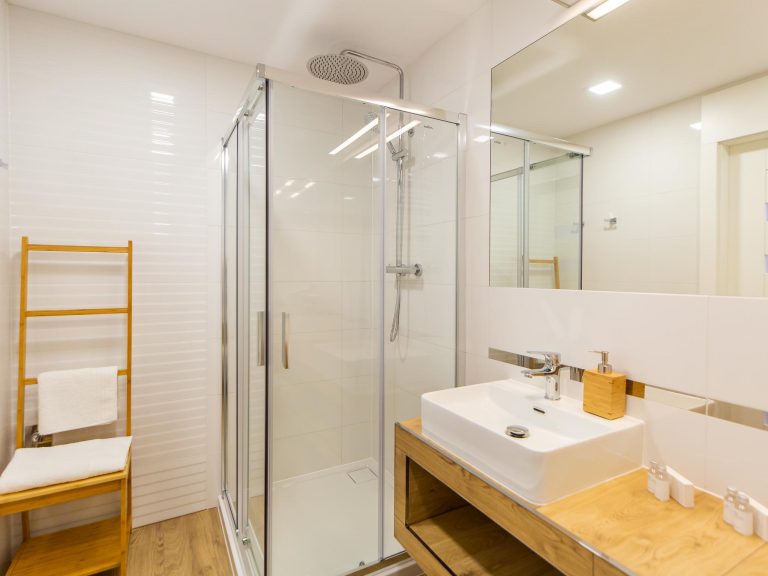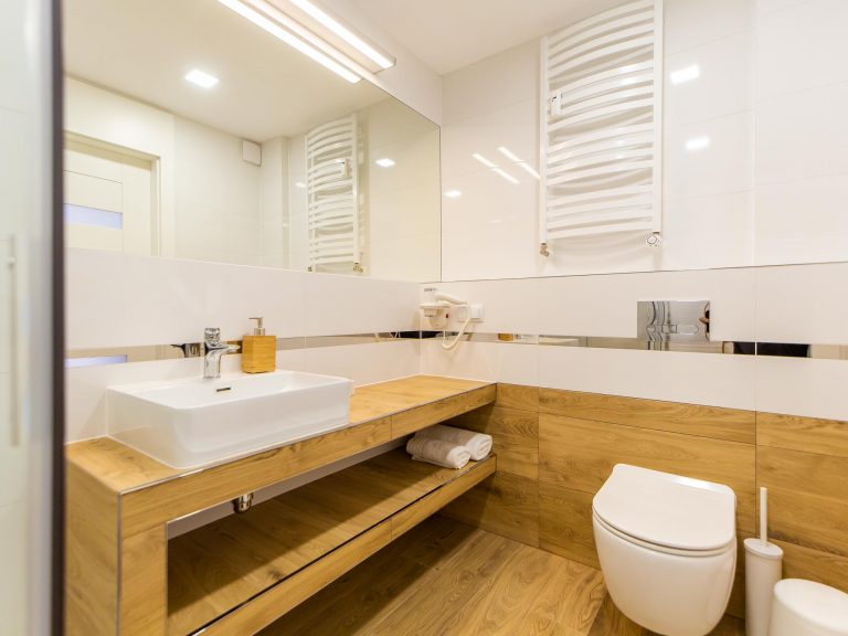 Prysznic,suszarka do włosów, zestaw ręczników.